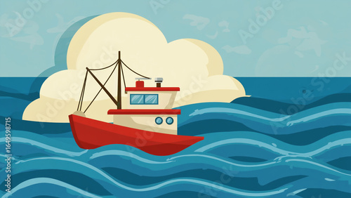Red Fishing Boat on Blue Ocean Waves, Sunny Nautical Scene