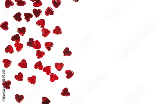 Red foil heart shaped confetti isolated on white backround.