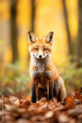 Red fox in the autumn forest. Beautiful wild animal in nature.