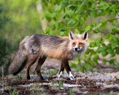 Red Fox Photo Stock. Fox Image. Close-up profile side view lin the springtime ooking at camera with a tree background and white moss ground in its environment and habitat.Picture. Portrait.