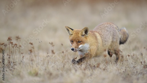 Red fox (Vulpes vulpes), runs in Meadow, Moravia, Czech Republic, Europe