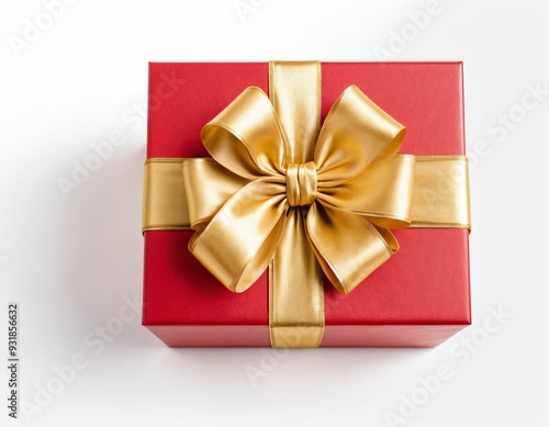 red gift box wrapped with gold bow and ribbon isolated on white background. Ai generated image.