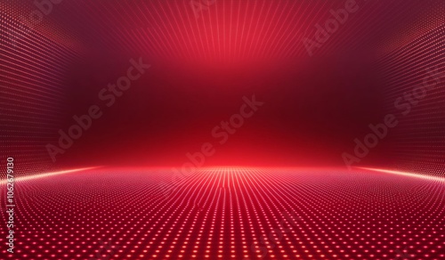 Red gradient background with a light effect and a digital mesh grid on a dark stage floor.