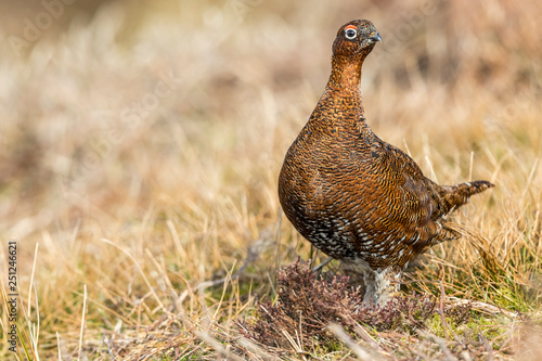 Red Grouse, (Lagopus lagopus) male or cock bird, with red eyebrow, stood in natural habitat on Grouse moor in Winter. Looking alert. Landscape, horizontal. Space for copy