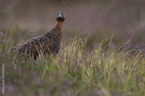 Red grouse, male cock bird facing left stood in colourful purple heather on Grouse Moor in Yorkshire, England, UK. Blurred, clean, green background. Scientific name: Lagopus lagopus. Space for copy.