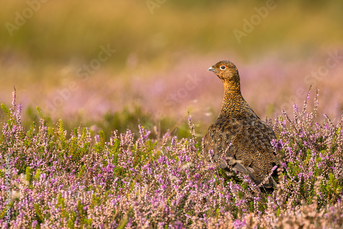 Red Grouse on managed grouse moorland. Scientific name: Lagopus Lagopus. Close up of a male Red Grouse in summer, facing left in colourful purple heather and bilberries. Horizontal. Space for copy.