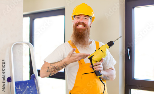 red hair man smiling cheerfully, feeling happy and showing a concept repairing home. handyman concept