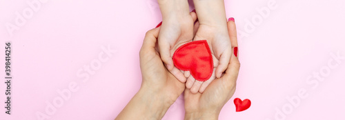 red heart in child and mother hands on pink background. concept of love, charity