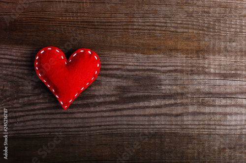 Red heart made of felt on a wooden table. Handmade blank for greeting card, copy space.
