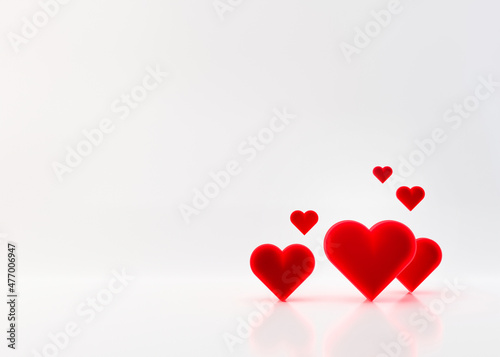 Red hearts on white background. Valentine's Day backdrop with free space for text, copy space. Postcard, greeting card design. 3D illustration. Love.