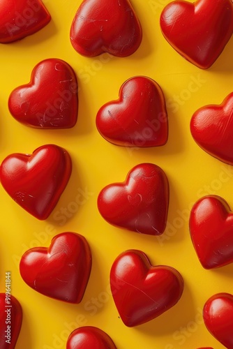 Red heart-shaped candies on a yellow background, perfect for festive occasions and celebrations.