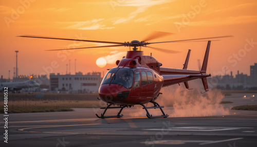 Red helicopter taxiing on a tarmac at sunset.