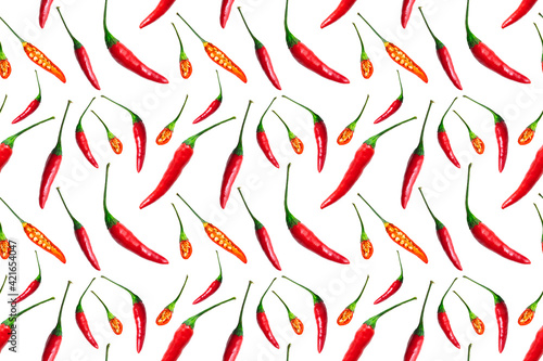 Red hot chili peppers seamless pattern isolated on white background. Top view. Flat lay. Banner
