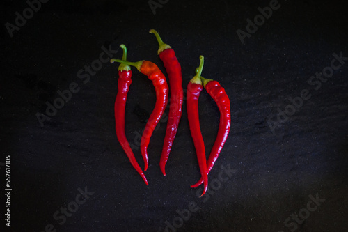 red hot fresh chili peppers on a stylish black kitchen working surface