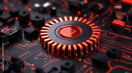 Red Illuminated Gear-like Component on a Futuristic Circuit Board