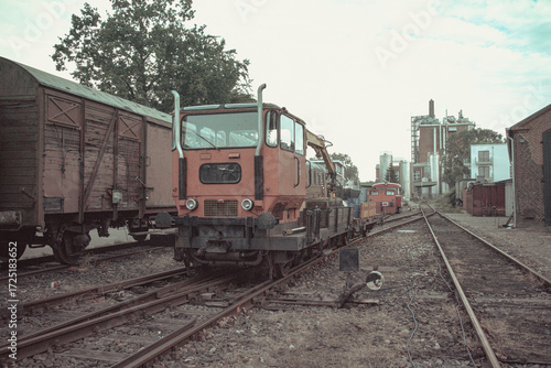 Red industrial railway maintenance vehicle on tracks near old freight wagons