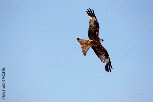 Red Kite, milvus milvus, Adult in Flight against Blue Sky