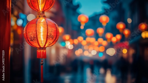 Red lanterns glow warmly above a lively street as people celebrate the Chinese New Year, creating a vibrant atmosphere filled with joy and tradition