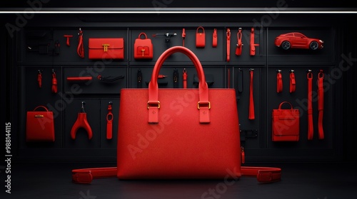 Red Leather Handbag with Gold Hardware Displayed on Black Shelf