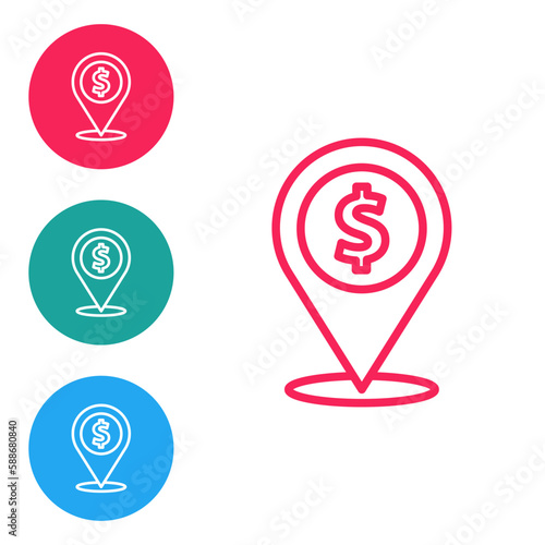 Red line Cash location pin icon isolated on white background. Pointer and dollar symbol. Money location. Business and investment concept. Set icons in circle buttons. Vector