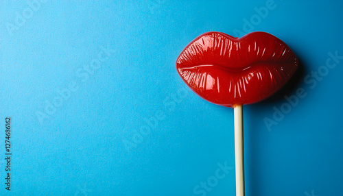 Red Lips Lollipop. Lollipop candy in the shape of red lips, minimal concept composition on blue background, top view, copy space