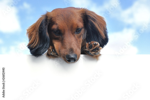 Red Long-Haired Dachshund Above a Blank Sign