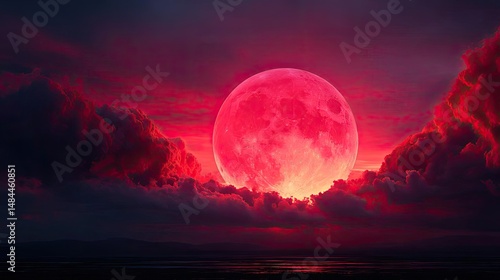 Red moon behind black clouds at night with abstract fire concept. A vibrant, red moon illuminating a dramatic twilight sky.