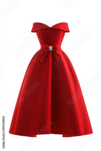 Red, off-the-shoulder, A-line, satin dress with bow detail