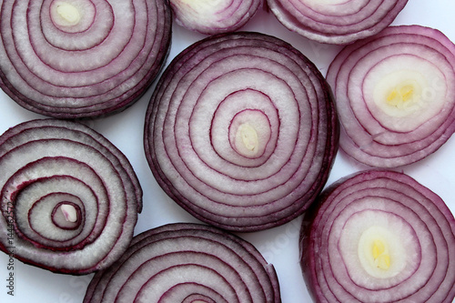 red onion sliced slices slices a few cloves closeup isolate following long-range plan