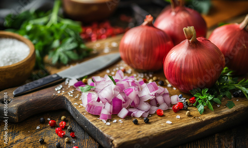 Red onions on a wooden cutting board. Slices of chopped onion. Whole and sliced onions, a knife. Recipe. Vegetables. Vegan. place for text. Copy space.