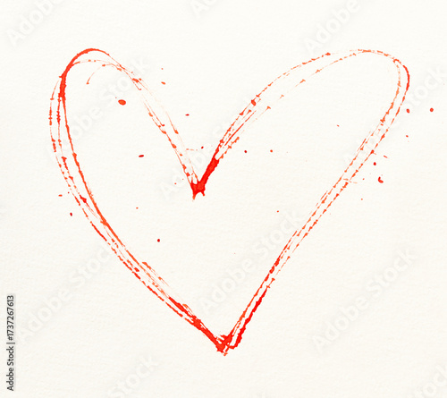 Red paint heart shape with splattered drops on white background expressing love and passion.