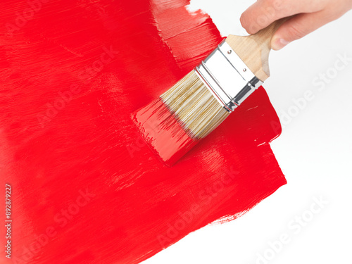 Red Paint patch and a paint Brush. Paints, home renovation, painter's services concept.