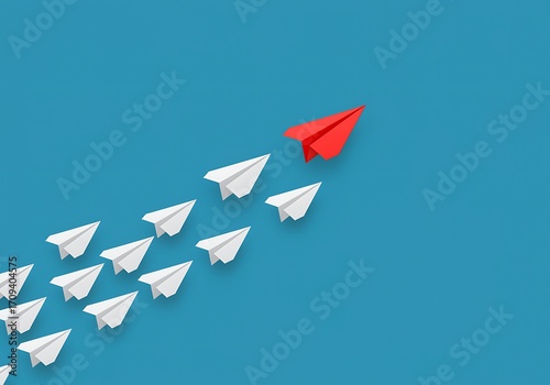 Red Paper Airplane Leading White Airplanes Symbolizing Leadership Innovation and Business Success on Blue Background