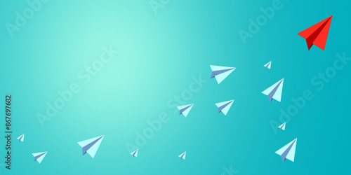 Red paper airplane leading white ones against a blue sky, illustrated background, concept of leadership. 3D Rendering