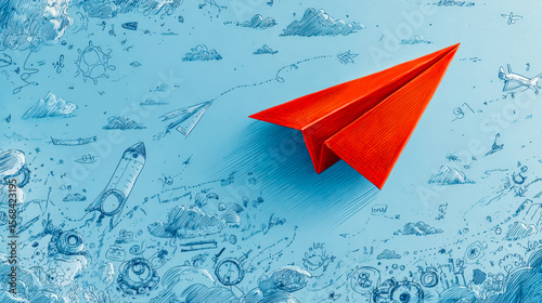 Red paper airplane soaring over a playful hand-drawn sky scene