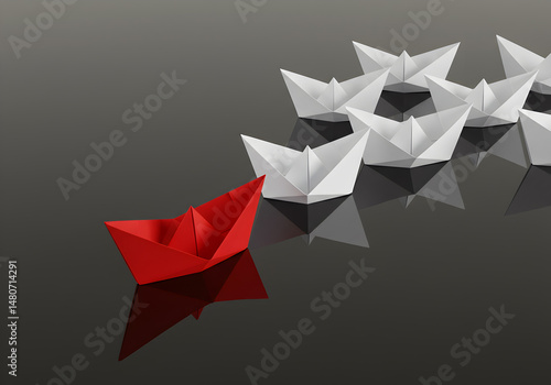 Red paper boat leads white fleet innovation leadership concept success strategy business metaphor