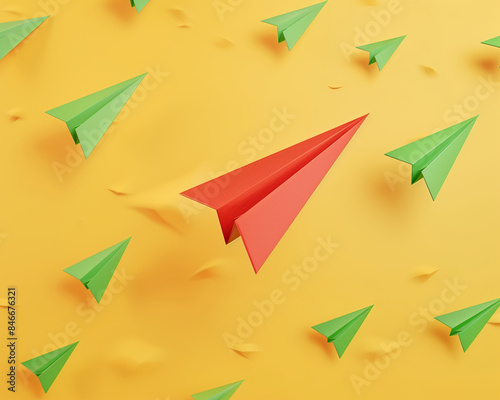 Red paper plane stands out among green ones on a yellow background symbolizing individuality and leadership. 3D rendering.