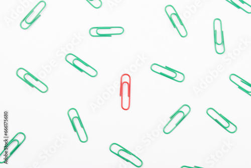 Red paperclip and multiple green paperclip on white background, unique and leadership concept