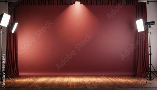 Red Photo Studio Backdrop with Wooden Floor and Lights.