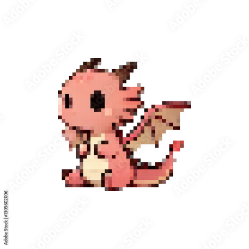 Red pixel baby dragon vector icon. Cute cartoon dragon. Baby dragon. Mythical creature red dragon. Baby dragon with wings. Vector 2d baby dragon icon for games.