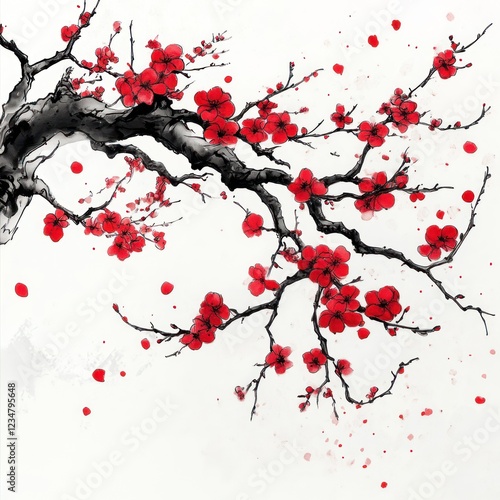 Red Plum Blossoms Branch Ink Wash Painting Art