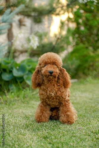 Red poodle sits on the grass in the park for a walk. Walk with your favorite poodle in the park in autumn.