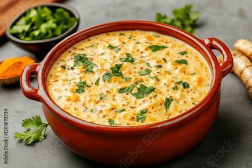 Red pot filled with melted cheese and fresh herbs on a wooden kitchen table
