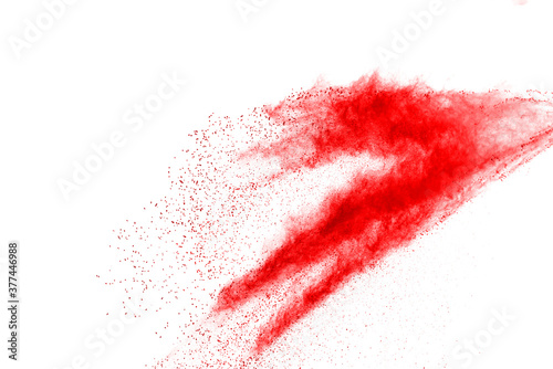 Red powder explosion on white background. Paint Holi.