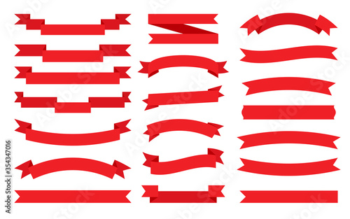 Red ribbon flat set. Retro flag, blank tape for text, price tag, sale label. Empty different shape simple ribbons template. Decorative cartoon paper banner. Isolated on white vector illustration
