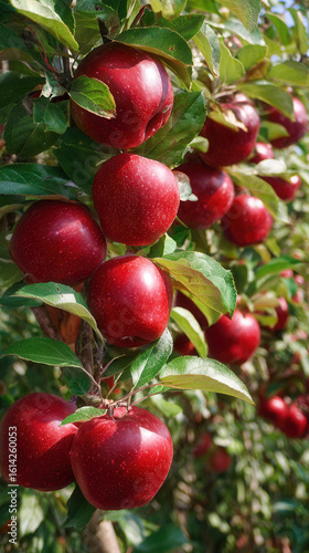 Red ripe apples growing on green apple tree branch with leaves creating fresh orchard harvest scene in natural sunlight