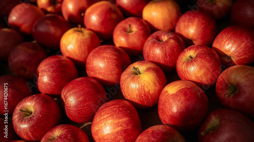 Red ripe apples harvested from an autumn orchard, arranged naturally as at a farmer’s market.