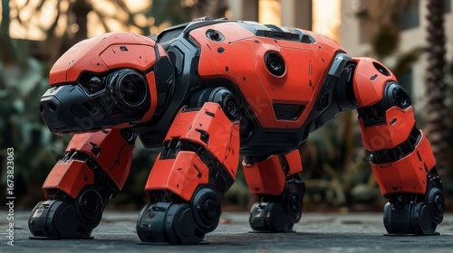 Red robotic dog, futuristic, outdoors