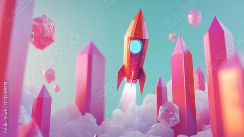 Red Rocket Launching Through Pink Crystal Landscape