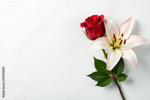 Red rose and white lily on a white background, roses, floral, delicate